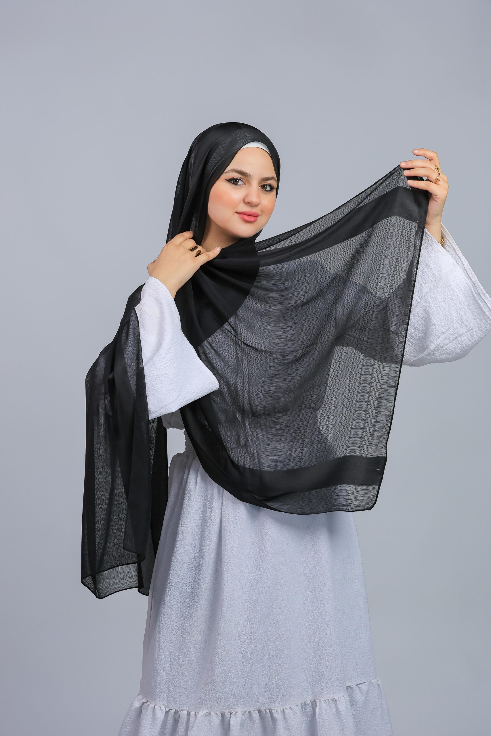 A stylish crinkled chiffon scarf with a soft satin finish, offering a chic balance of texture and elegance. Perfect for everyday wear and special occasions.