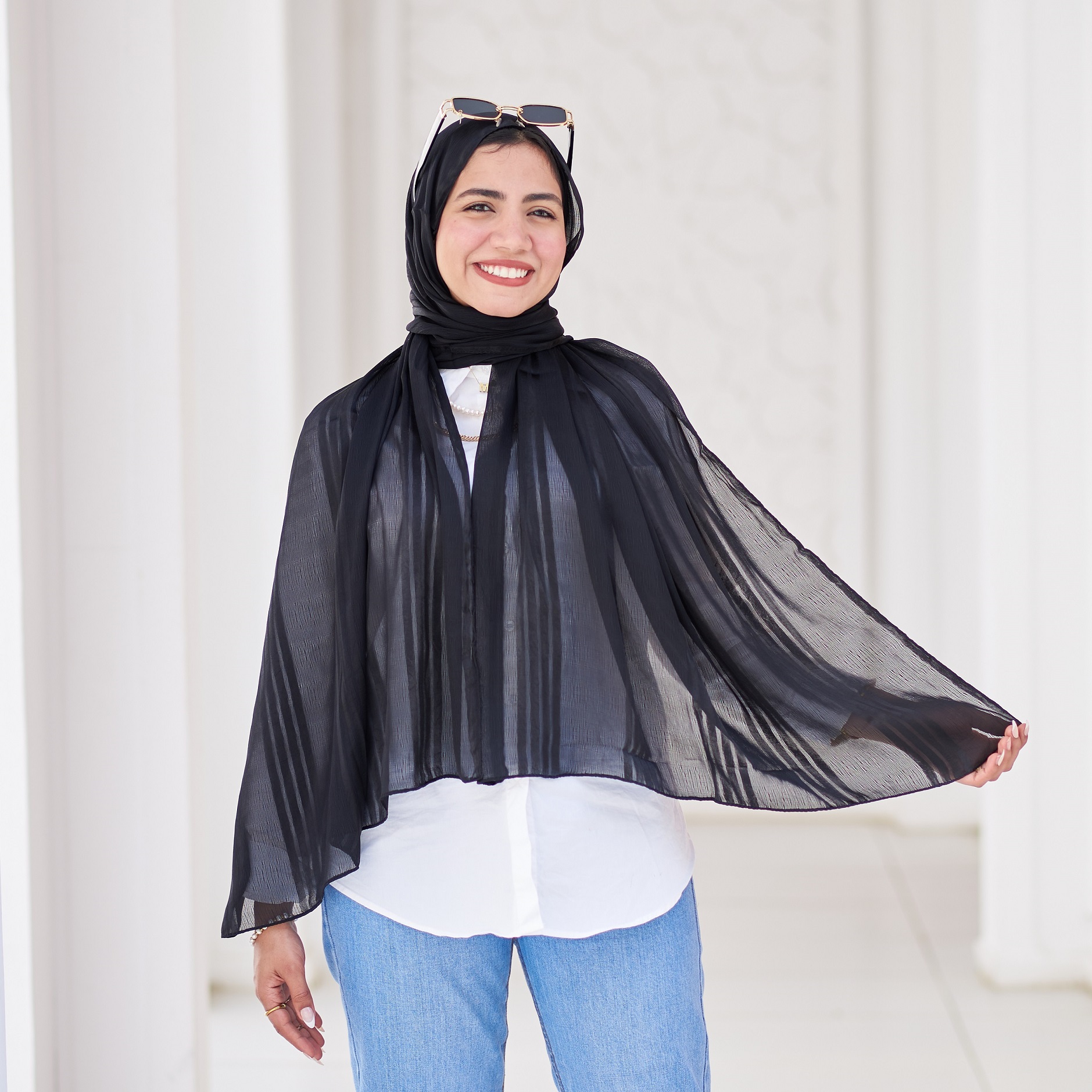 A stylish crinkled chiffon scarf with a soft satin finish, offering a chic balance of texture and elegance. Perfect for everyday wear and special occasions.